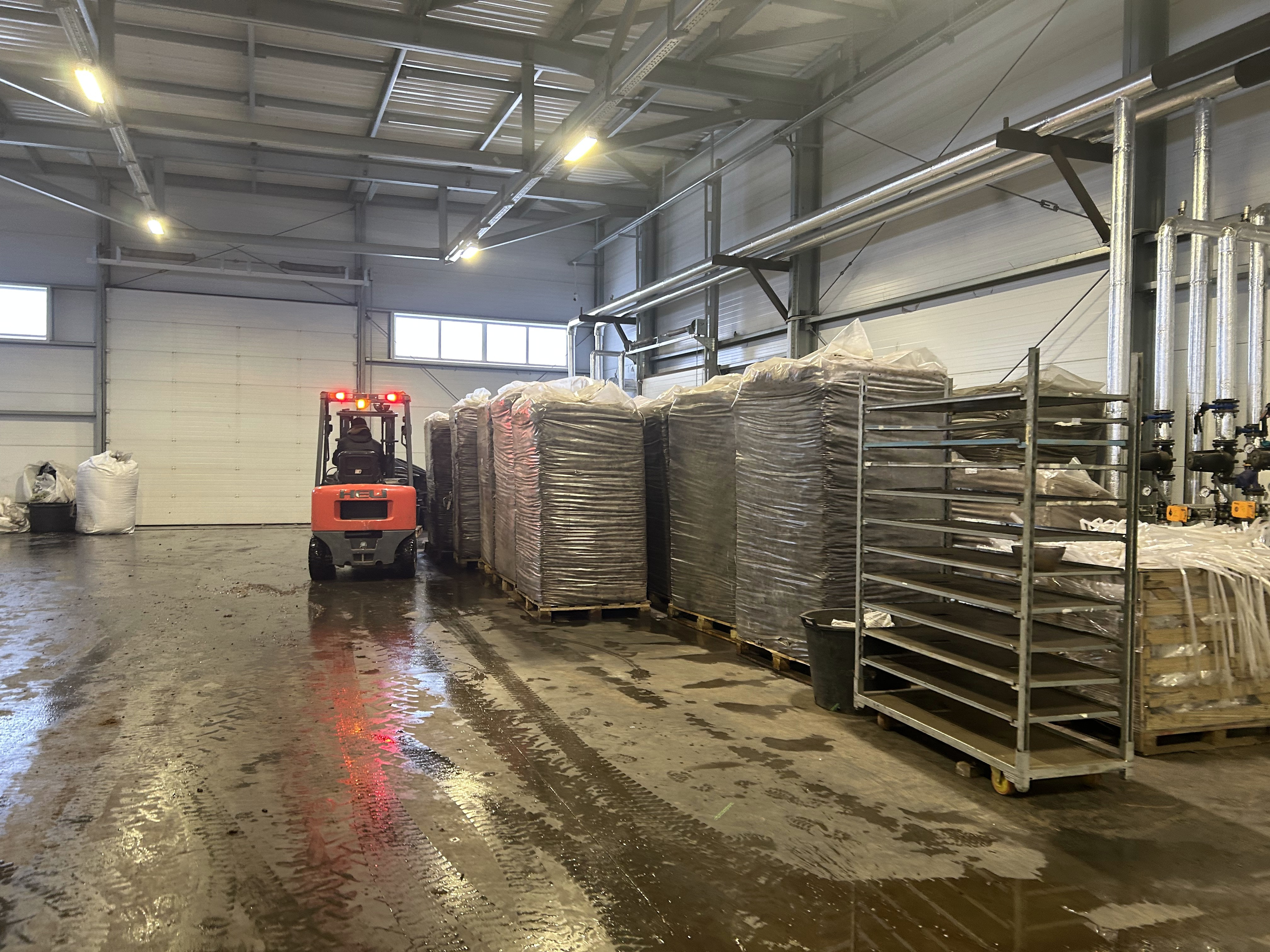 Цех заполнен запасами торфа, который для посадки в контейнеры нам помогает подготовить торфо-распушительная машина